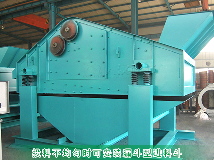 砂巖礦用振動篩一般篩分產量比較大,進料時投料量也會很大,所以很容易造成篩面物料堆積,影響過網率,出現篩網堵塞的情況,所以在進料時需要均勻進料,不要一次性投入過多物料。可在進料口上蓋上加裝一個漏斗型的進料斗,使砂巖勻速進料避免堆積。