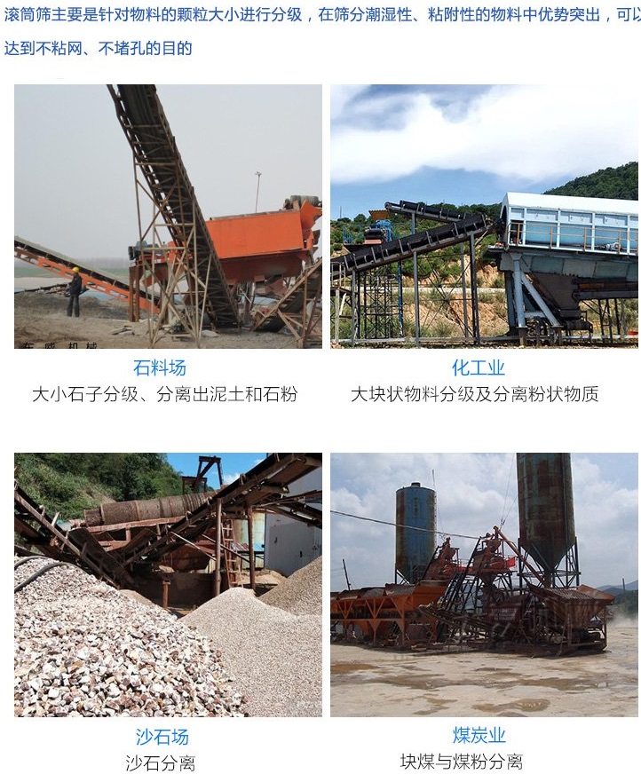 滾筒篩由一個(gè)穿孔的圓柱形滾筒組成,該滾筒通常在進(jìn)料端以一定角度升高,當(dāng)進(jìn)料沿旋轉(zhuǎn)滾筒螺旋向下時(shí)實(shí)現(xiàn)物理尺寸分離,其中小于篩孔的尺寸過(guò)小的材料通過(guò)篩網(wǎng),而尺寸過(guò)大的材料從滾筒的另一端排出,用于粘性和纖維材料的分類,例如在煤炭或天然石材工業(yè)中。