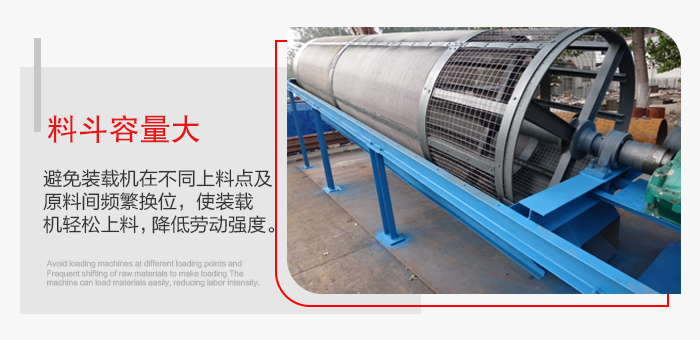 4.儲料斗容量大,使裝載機合理安排主設(shè)備(如攪拌站)與篩砂機的上料時間,避免裝載機在不同上料點 及原料間頻繁換位,使裝載機輕松上料,降低勞動強度。