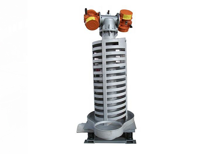 SZC系列垂直振動提升機的驅動裝置振動電機安裝在輸送塔下部,兩臺振動電機對稱交叉安裝,輸送塔由管體和焊接在管體周圍的螺旋輸送槽組成,輸送塔座于減振裝置上,減振裝置由底座和隔振彈簧組成。當垂直輸送機工作時,根據雙振動電機自同步原理,由振動電機產生激振力,強迫整個輸送塔體作水平圓運動和向上垂直運動的空間復合振動,螺旋槽內的物料則受輸送槽的作用,作勻速拋擲圓運動,沿輸送槽體向上運動,從而完成物料的向上(或向下)輸送作業。